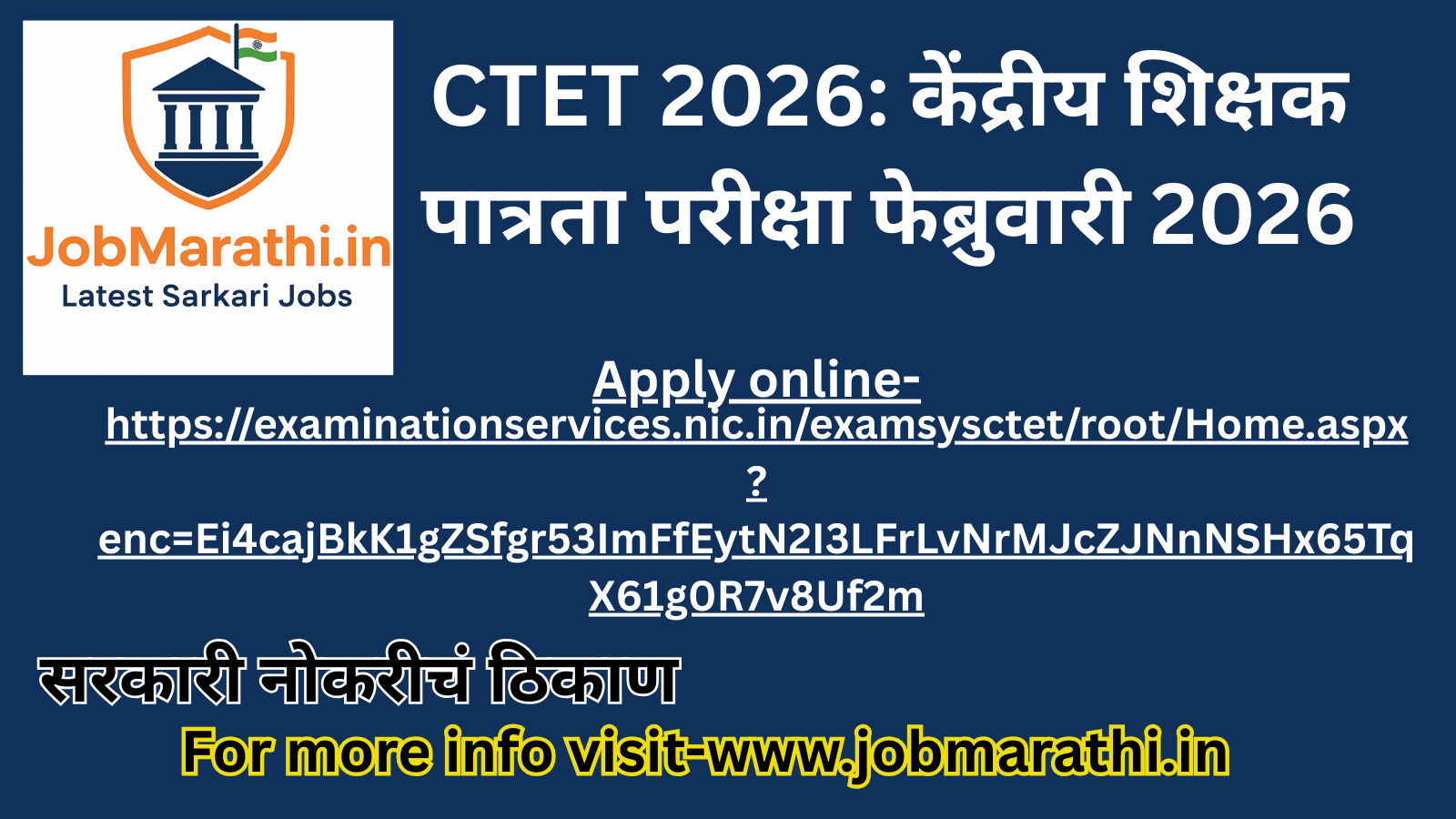 CTET 2026 : केंद्रीय शिक्षक पात्रता परीक्षा फेब्रुवारी 2026 – अर्ज प्रक्रिया, पात्रता, अभ्यासक्रम व महत्वाच्या तारखा केंद्रीय माध्यमिक शिक्षण मंडळ (CBSE) कडून CTET 2026 (Central Teacher Eligibility Test) फेब्रुवारी सत्रासाठी परीक्षा आयोजित करण्यात येणार आहे. भारतातील सर्व केंद्रीय शाळांमध्ये (KVS, NVS, Army School, Kendriya Vidyalaya, सरकारी/खाजगी शाळा) शिक्षक म्हणून नोकरीसाठी CTET उत्तीर्ण असणे अत्यंत … Read more
